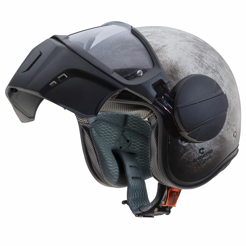 Forma e stile aggressivo si uniscono ad una funzionalità e praticità unica sul mercato. Questo jet è infatti equipaggiato con una particolare visiera a forma di occhiale che aderisce al viso grazie alla spugna presente sul profilo inferiore della stessa, oltre ad una maschera che protegge il viso dagli agenti atmosferici e dagli insetti. Grazie ad un meccanismo basculante a molle, il movimento di apertura e chiusura della visiera completa di maschera è semplice e intuitivo e può essere fatto con estrema facilità utilizzando solo una mano, a differenza dei caschi Jet con occhiali e maschere con semplici elastici.